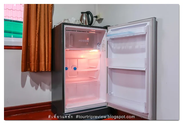 ด้านหน้าเราจะเป็นตำแหน่งของตู้เย็นขนาดเล็ก ภายในตู้เย็นมีน้ำดื่มฟรีให้ 2 ขวดตามระเบียบโรงแรมหรือรีสอร์ททั่วไป ที่บนหลังตู้เย็นมี กาแฟ 2 ซอง กาต้มน้ำ แก้วและช้อนกาแฟ 2 ชุด แก้วน้ำดื่ม 2 ใบพร้อมกับกระดาษทิชชู 1 ม้วน ส่วนด้านขวามือมี ถังขยะใบเล็ก ราวตากผ้า และตู้เสื้อผ้าตั้งอยู่หน้าห้องน้ำ ภายในตู้เสื้อผ้ามีหมอนให้อีก 2 ใบ ผ้าเช็ดตัว 2 ผืน และไม้แขวนผ้า 3 อัน ส่วนเต้ารับปลั๊กไฟฟ้าเป็นแบบ 3 รูรองรับปลั๊กไฟฟ้าได้ถึง 3 ขา