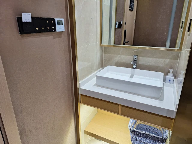 มีอ่างล้างหน้าพร้อมกระจกบานใหญ่อยู่ติดกับประตูทางเข้าห้อง